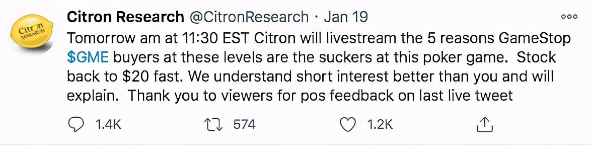 1月21日,安德鲁在香橼的推特上发表了一则视频评论,他在评论中称,GME,每股只值20美元。