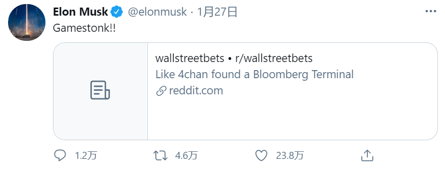 马斯克也发推,指路WallStreetBet,给GME的股价添了一把火。