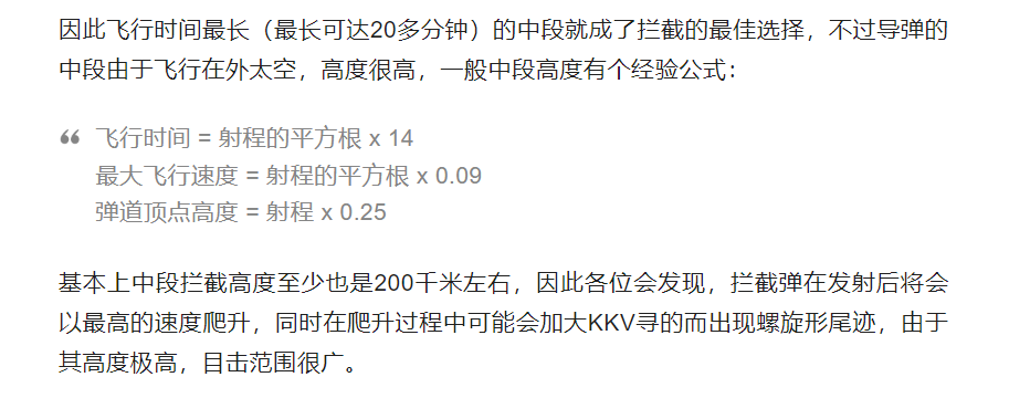 中段反导是在弹道导弹在飞行的中段时用导弹对其进行拦截,一枚弹道导弹从发射到击中目标,大部分时间是在大气层外飞行的,这里有个经验公式可以计算下弹道导弹中段飞行的最高高度: