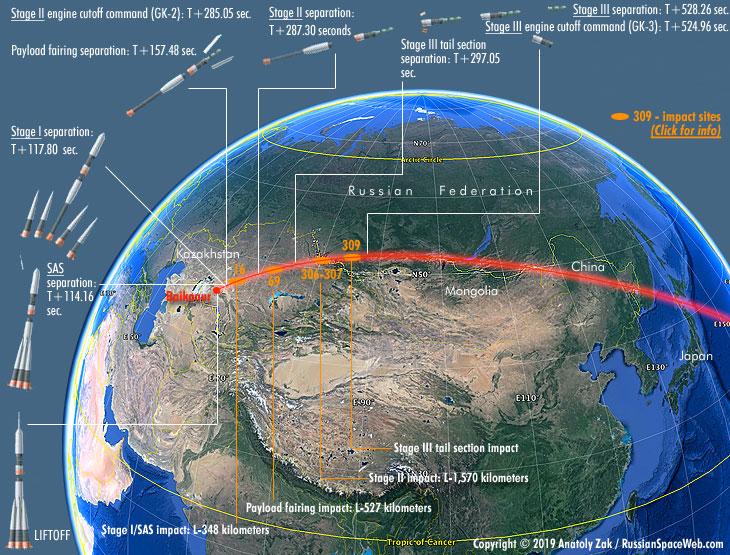 拜科努尔的纬度为45°,要发射卫星,假如不做任何变轨转向操作的话那么发射的物体倾角就是45°,因为绕地时必须绕地球中心公转,这次拜科努尔向国际空间站(ISS)发射,ISS的轨道高度是413 x 422千米,倾角是51.64°。