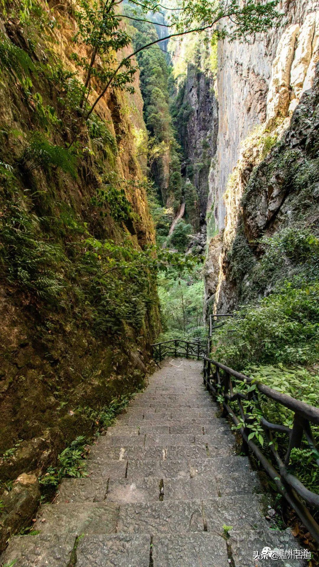 过仙人桥,沿着游步道登山,随行的朋友感叹道路陡峭。抬头仰望,两崖之上一线蓝天,大家都奋勇攀登,游步道仿佛是天梯,上面定是美景无限。